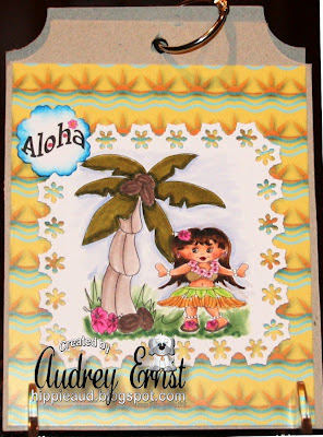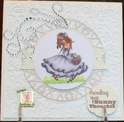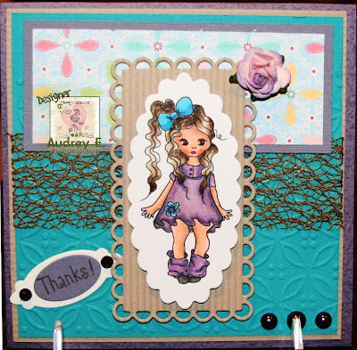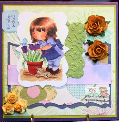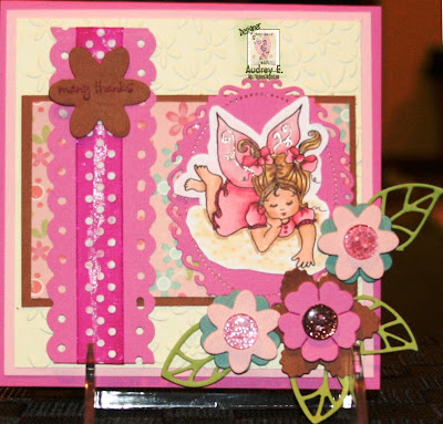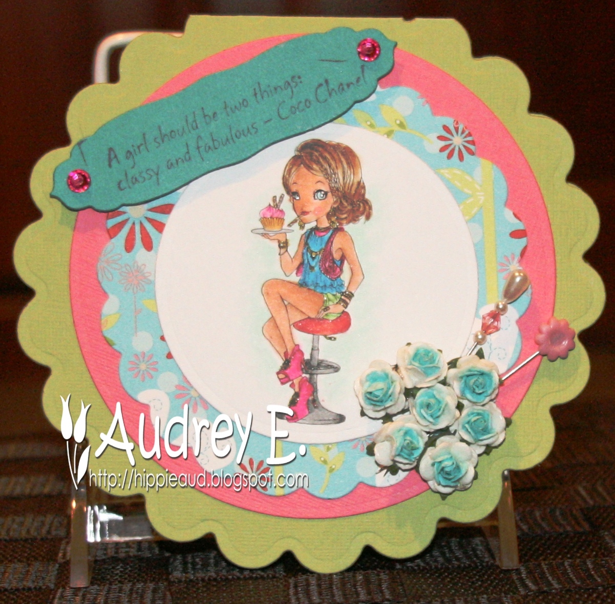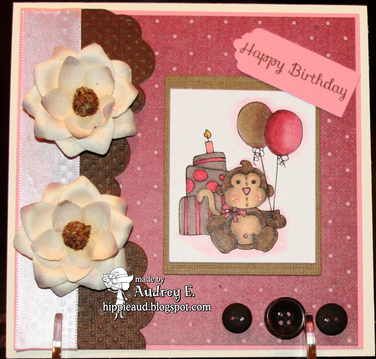 Summer Monkey uses Nesties for image and sentiment and Taylored Expressions die or scalloped piece. Ribbon is Offray, flowers Prima, buttons MFT.
