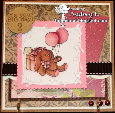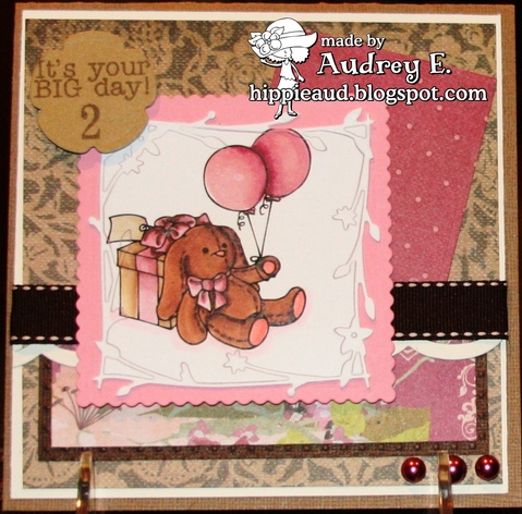 LITTLE MISS MUFFET STAMPS images are colored with Copics, the Monkey has Sakura gel pen added to his cheeks and I used Sakura glaze pen on the monster’s horns. All cards feature Prima DP, sentiment from A. Jillian Designs (#2 added on bunny card is from CTMH), SU, Bazzill and Core-dinations papers.