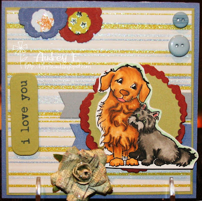 For my creation, I have chosen WAGS N WHISKERS image “Snuzzle Love.”  This image is just adorable - I have colored it with Copics and cut all shapes with Nesties.  I embossed the back circles with Cuttlebug folder.  Papers are from Bazzill and Coredinations, no DP for a change!  Ribbon and velvet trim from Taylored Expressions, sentiment from Unity and stamped on pre-cut tag that was in my stash.  Gorgeous flowers with beaded centers are Petaloo.  Brad is also from my stash.  Hope you like it and will come join us!!