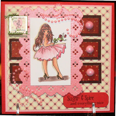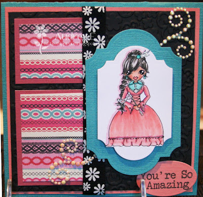 I have colored this adorable PIXIE DUST STUDIO SHOP image “Belle of the Ball” with Copics and Sakura glaze pen.  CS from Bazzill, black paper is embossed with Nestabilities folder, ribbon from Michael’s, DP from Prima, shapes cut with Nesties, bling from Zva Creative, sentiment from My Craft Spot.  Hope you like it and that you’ll come join us!