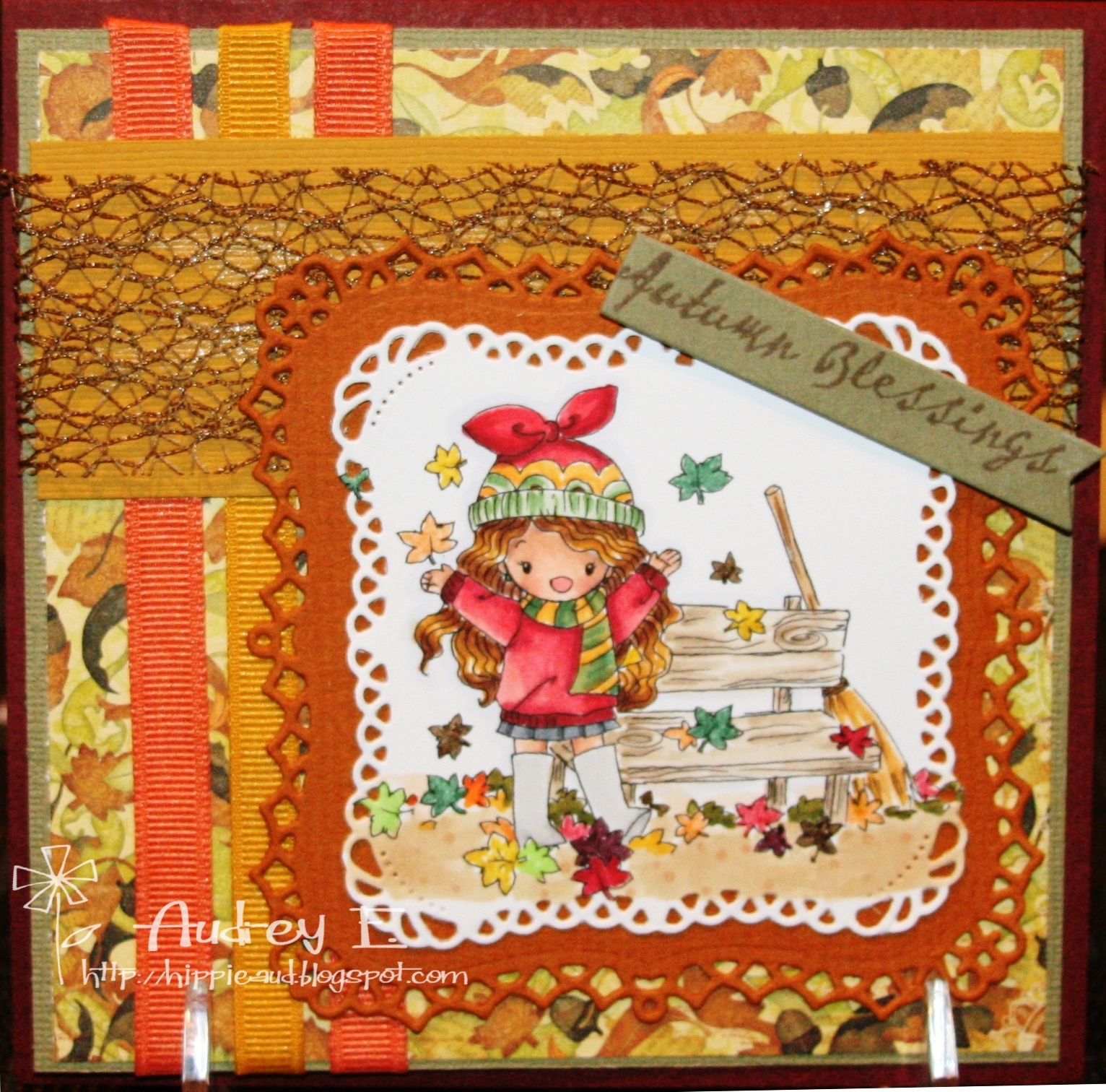 For today’s creation I used MILKCOFFEE SHOP image “Michelle Playing with Fallen Leaves.”  I absolutely adore this cute image – her hat and scarf are especially sweet!!  I have colored the image with Copics and Atyou Spicas and cut with my new Nesties.  I added lace mesh from my stash, ribbon from Taylored Expressions, sentiment cut with MFT die from clear stamp set, papers from Bazzill and DP from Bo Bunny.  I use hope you like it and come play along!