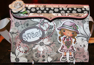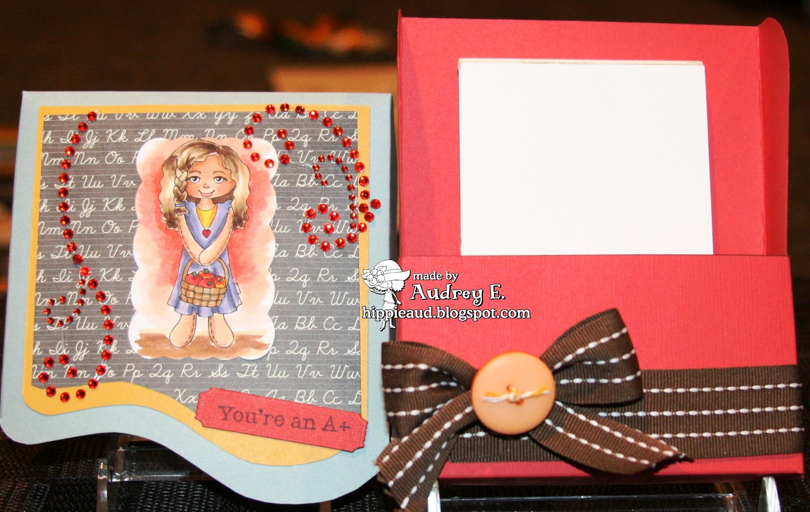 As you can see, I’m still fixated on back to school creations – am I that thrilled my kids are back at school?!?  LOL  For my project this week, I have chosen LITTLE MISS MUFFET STAMPS image “Licorice” from the Spice Doll collection.   I have colored her with Copics and cut out with Sizzix die.  I used the slip cover template from My Time Made Easy using CS from Taylored Expressions and embellished with letter DP from My Mind’s Eye, ribbon from my stash, button from Basic Grey, twine from My Craft Spot, sentiment from Taylored Expressions cut with Lifestyle Crafts die and bling from Zva Creative.  I have added a pad of note paper to the inside thinking this would make a great teacher gift.  Hope you like it and will come join our challenge!