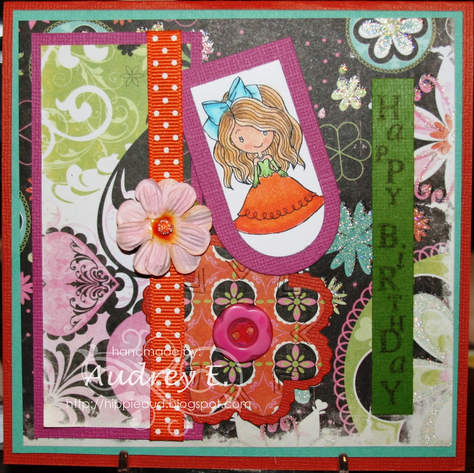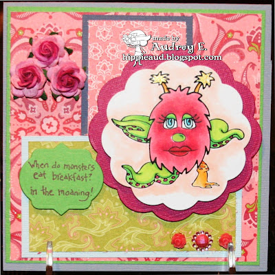 I put everything together using GIMP – I am by far not a master at doing this, so if I can do it, anyone can and GIMP is a free download.  I have colored my monster with Copics and Fiskars glitter gel pens and cut with Nesties.  I have chosen Bazzill CS and SU DP for my card as well as Wild Orchid flowers and crystals/bling from Prima.  Sentiment is from Inky Antics rubber stamp and cut with Nestie.  Sure hope you like it!