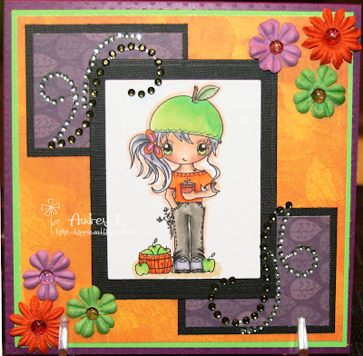 I have colored this adorable PIXIE DUST STUDIO SHOP image “Poppy.”  I think she is so sweetSmile  I have colored her with Copics and cut with Nesties.  I have added papers from Bazzill and DP from Bo Bunny and Cloud 9 Design.  Flowers are from Prima, dew drops from Robin’s Nest and bling from Zva Creative.  I decided to leave the card with no sentiment so it could be used for fall, Halloween or anything else that may fit.  Hope you like it and will come play in our challenge!