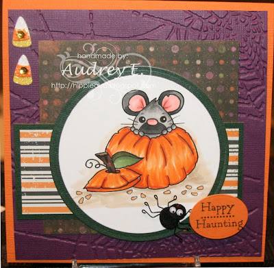 I have colored this adorable PIXIE DUST STUDIO SHOP image “Harvest Mouse” with Copics and cut with MFT die.  Papers are Bazzill and Core-dinations and DP is Authentique.  Sentiment is from MFT, candy corn and spider stickers from Jolee’s Boutique.  I used a Sizziz/Tim Holtz folder to emboss the spider webs.  Hope you like it and will come play alongSmile