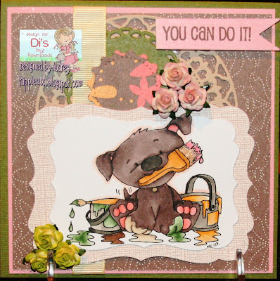 For my creation this time, I have chosen DI'S DIGI DOWNLOADS image “DIY PUPPY” and have colored him with Copics and cut out with Nesties.  Background circles also cut with Nesties as is sentiment from Cardz TV.   Papers are Bazzill and Coredinations and DP is SU as is ribbon.  Flowers are from Wild Orchid Crafts.  Sure hope you like it and will come join us!!