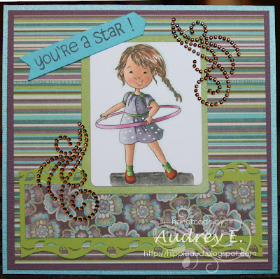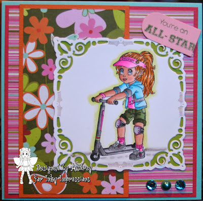 For my creation this week, I have chosen INKY IMPRESSIONS rubber stamp Spunky Scooter LiLi. Image is colored with Copics and cut out with Nesties. Sentiment is from Your Next Stamp and cut out with Lifestyle Crafts die. Bling and pearl from Prima. DP is K and Co. and CS is Bazzill. Hope you like it and will come play along:)