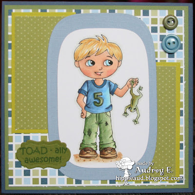 I also made a card with this week's Spotlight rubber stamp "Bandit Boy Tom." Again, practicing some new ways to use my Copics - different color combos and really thinking about how the light is hitting the image, I colored this awesome image. He is cut out using Nesties, buttons from SU and MFT added. DP is also SU and CS is Bazzill. Sentiment is from Cardz TV and cut out with Nestie.