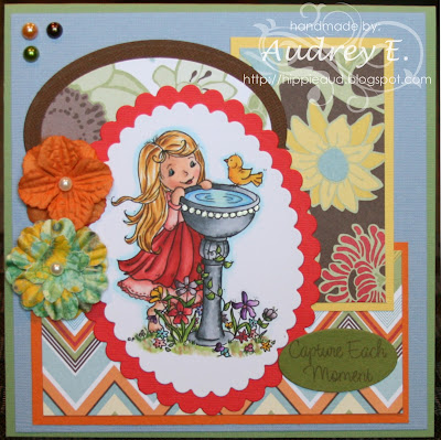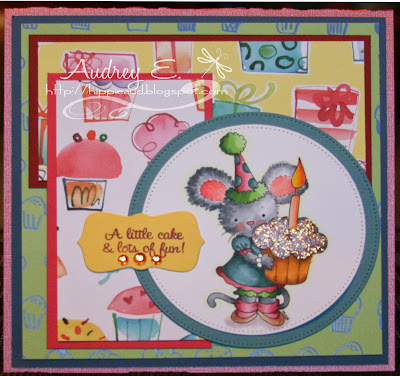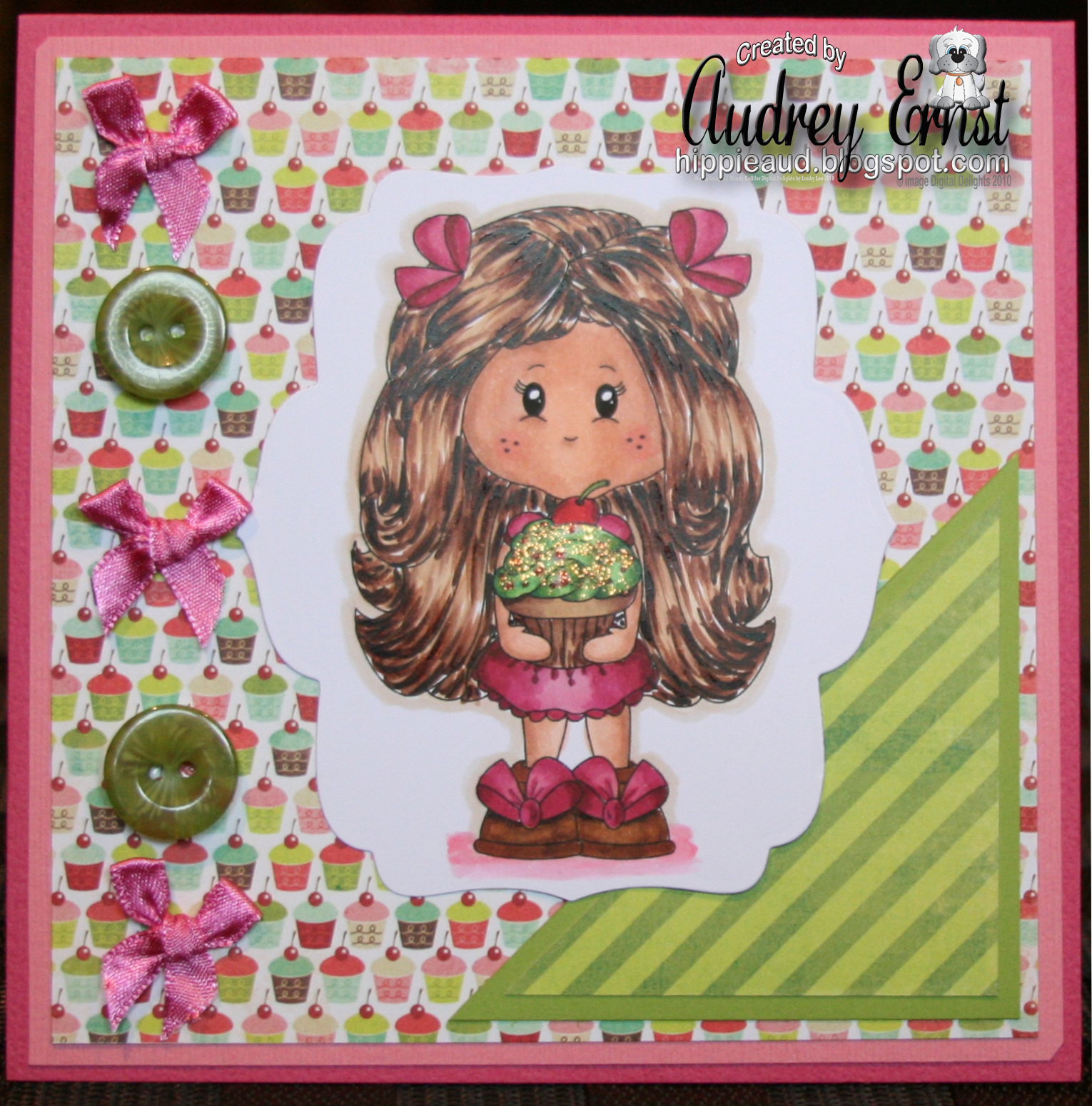 For my creation today, I have chosen DIGITAL DELIGHTS SHOP image Cupcake Josie. I have colored her with Copics and added Stickles to the frosted part of the cupcake. Image is cut with Nestie. DP is from My Mind's Eye, bows from Wild Orchid Crafts and buttons from SU. CS is Bazzill. Sure hope you like it and will come play along:)