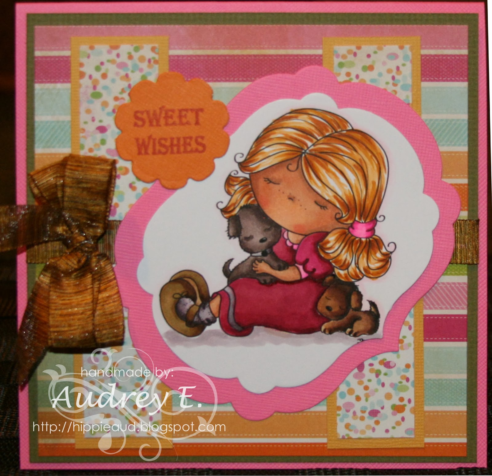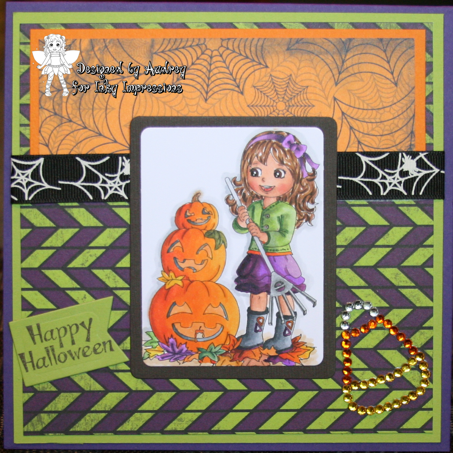 I have used INKY IMPRESSIONS SHOP New Release digi "Angelica's Stacked Pumpkins." I love this cute image and it was great fun to color. I cut it out with Taylored Expressions dies. Papers are from Bo Bunny DP and Bazzill CS. Ribbon and candy corn bling sticker are from my stash. Sentiment is from Taylored Expressions and cut with S & P Co. die. Sure hope you like it:)