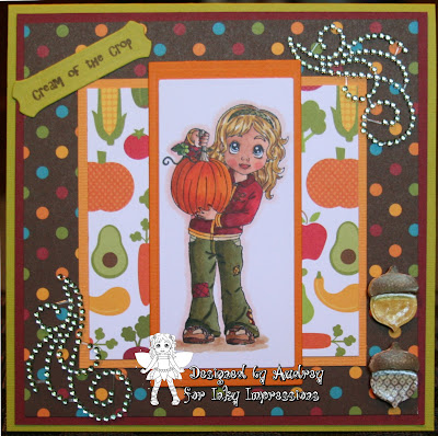 For my creation this week, I have chosen INKY IMPRESSIONS rubber stamp LiLi's Pumpkin. I have colored her with Copics and cut out with Nesties. Papers are Doodlebug Designs DP and Bazzill CS. Acorn stickers are K and Co., bling flourishes from Zva Creative, sentiment, from Pink By Designs cut with Nestie. Sure hope you like it and will come play along!