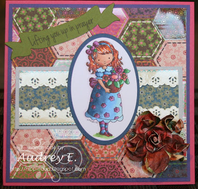 I have colored this sweetie with Copics. I have been playing around with some more daring Copic color combos and techniques, and I hope you can see the results on this card. I have used papers from DCWV DP and Bazzill CS. I added a Prima flower and sentiment from A. Jillian Vance Designs that I think fits the image perfectly. Image cut out with Nellie's dies. Sentiment cut with Nestie. Remember, FAITH FLOWERS and all the other of Mabelle's FABULOUS images are available at WHIMSY AND STARS STUDIO SHOP.