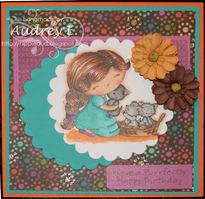My creation today uses DI’S DIGI STAMPS image "Daisies Kittens." I love this image, it is so adorable and was such fun to color with Copics and then cut out with die from Hot Off the Press. Sentiment is from MFT and cut with Nestie. Flowers are Recollections, DP is DCWV and CS is Bazzill. Sure hope you like it and will come join our challenge!
