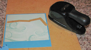 I cut the blue pieces 1/4 inch shorter each time, so my strips are 1.5, 1.25 and 1 inch by 5.5 inches and I punch out the waves on each strip, then I reverse the middle strip so you can see all the waves clearly.