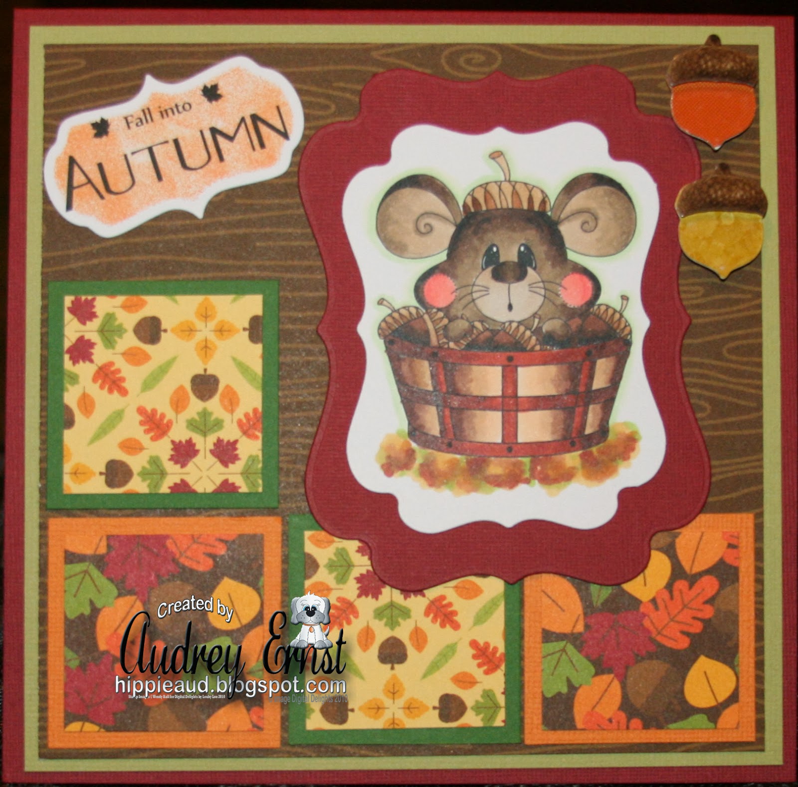 For my creation today, I have chosen DIGITAL DELIGHTS SHOP image Acorn Mouse and sentiment from Fall Sentiments set . I have colored image with Copics and cut out with Lifestyle Crafts dies. I coloring the area under the basket to look like leaves. Sentiment is also cut with Lifestyle Crafts die and daubed with Memento ink. DP is from Doodlebug Designs and CS is Bazzill. Stickers are from Recollections. Sure hope you like it and will come play along:)