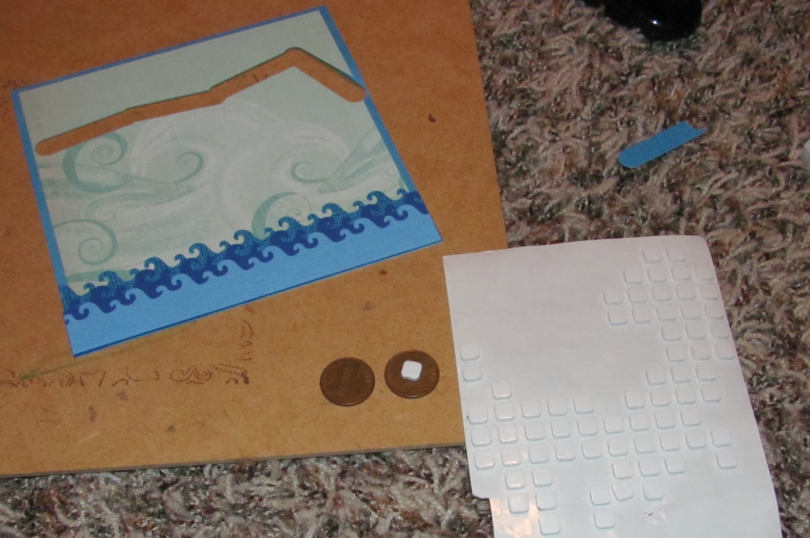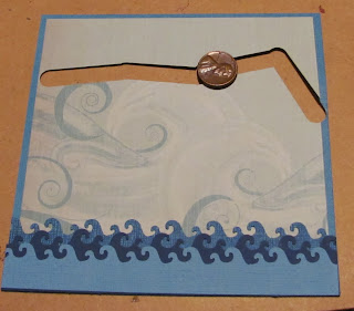To make the image move, I take 2 pennies and stick one on each side of my card and affix with a pop up dot. The penny moves nicely back and forth through the cut out portion.