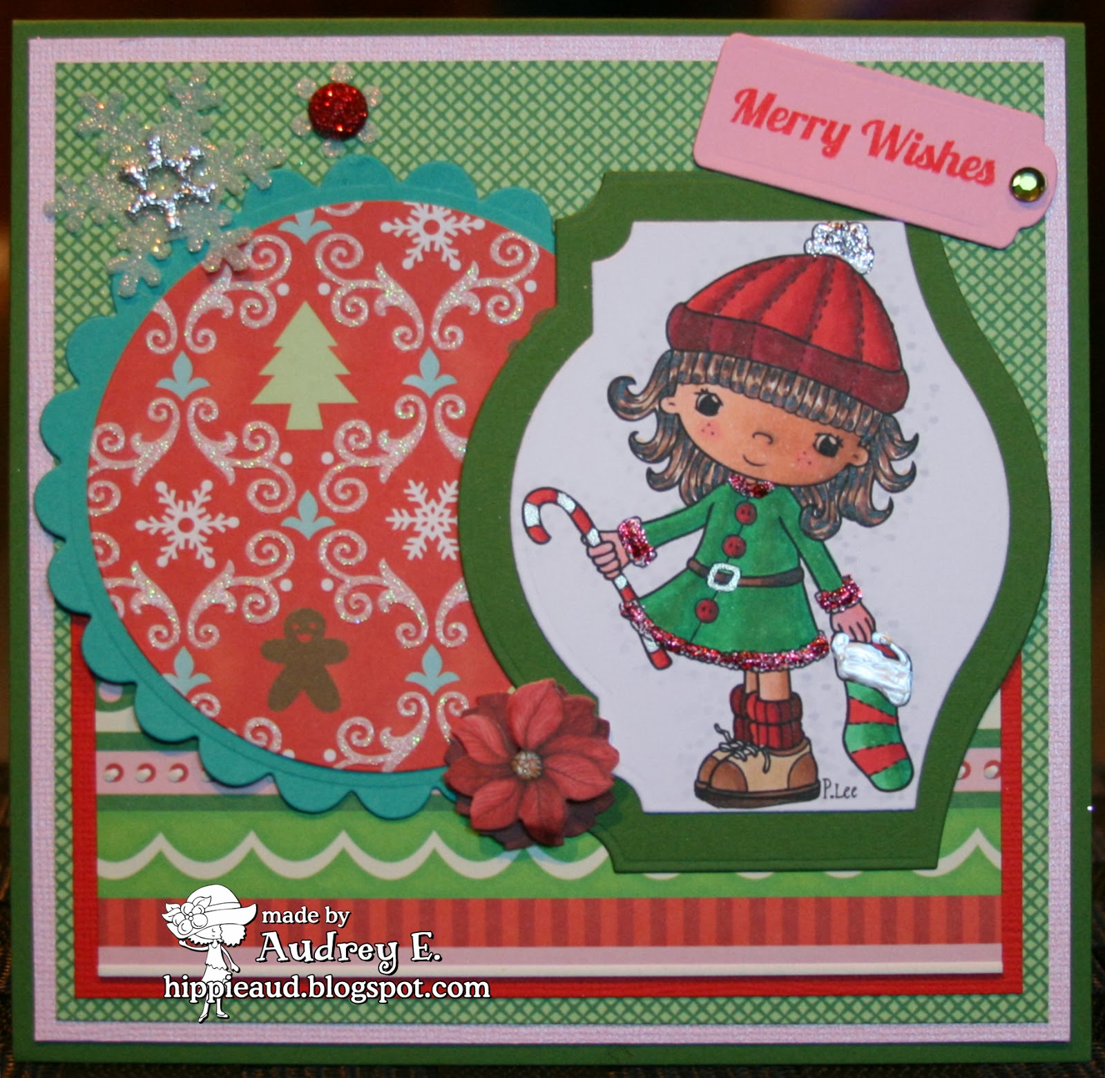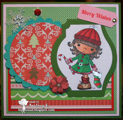 Today I used LITTLE MISS MUFFET STAMPS Swings N Slides Little Miss Christmas rubber stamp. I have colored her with Copics and Sakura pens and cut out with Taylored Expressions dies. I added Liquid Pearl and Stickles. Papers are K and Co. DP and CS from Bazzill. Poinsettia sticker is K and Co. and bling snowflakes are Martha Stewart. Sentiment is from SP & Company and cut with Nestie then added Darice bling. Circle shapes cut with Hot Off the Press dies. Sure hope you like it and will come play along!!