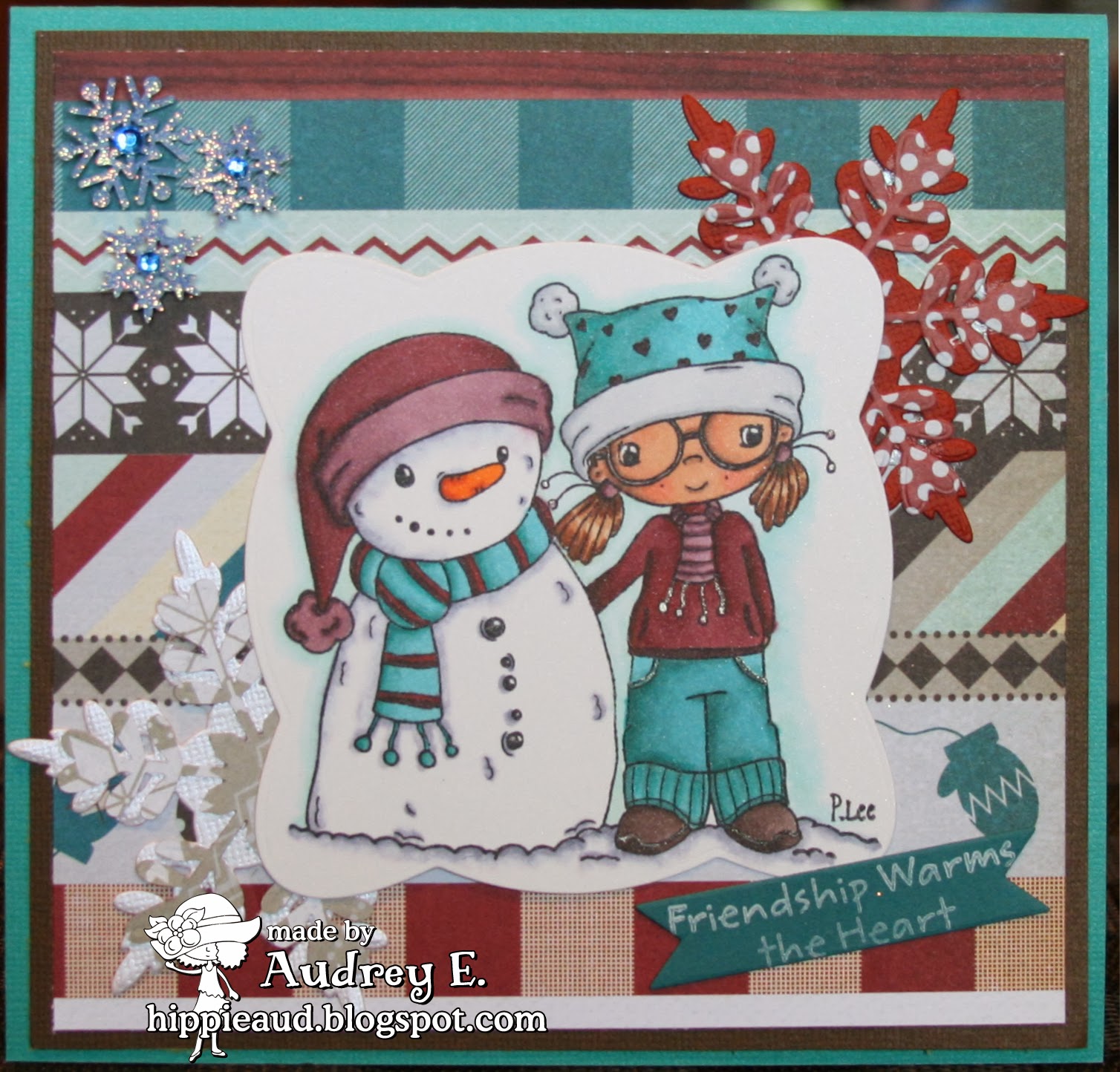 My creation today uses DI’S DIGI STAMPS image Pippa's Silly Snowmen. This image is such fun. I have colored it with Copics, cut with Marianne Design die and added Stickles. Bazzill and SU paper used for snowflakes done with die from Top Dog. DP is Whimsy Stamps, ribbon from Really Reasonable Ribbon and CS from Bazzill and Darice. Sentiments from Whimsical Designs and My Craft Spot and cut with Marianne die. Pearls added to snowflakes are from Prima. Sure hope you like it and will come play along!!