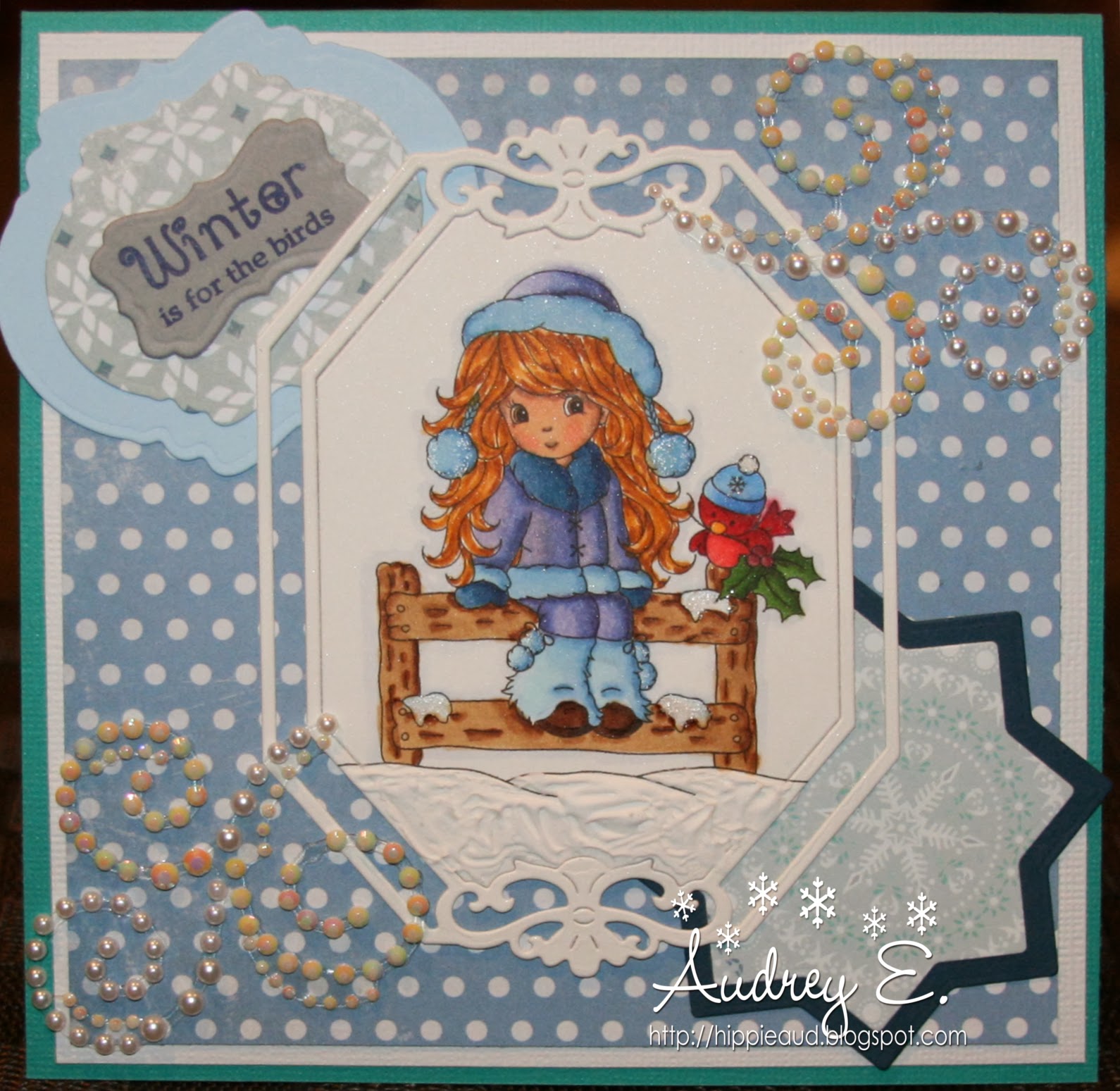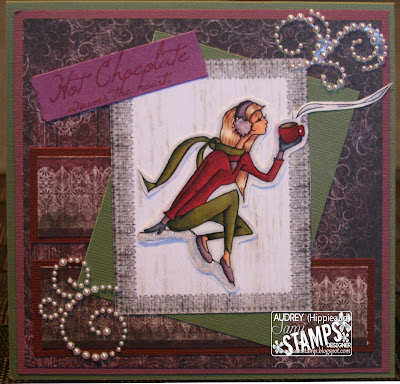 I have used SAMI STAMPS SHOP image Hot Cocoa Wind, what a gorgeous image! I have colored it with Copics, cut with scissors and added Stickles. I chose DP from Heartfelt Creations and CS from SU and Core-dinations. Pearl flourished are Prima, sentiment is from My Craft Spot and cut with MFT die. Sure hope you like it and will play along with us:)