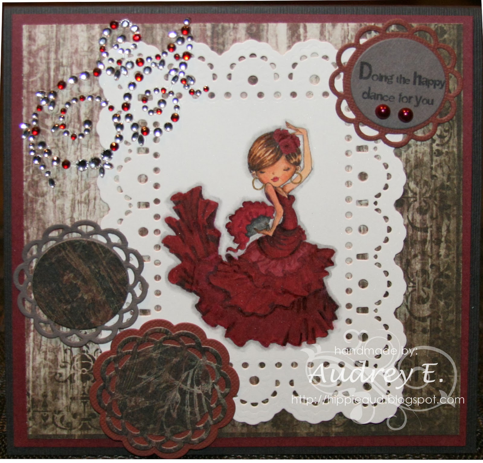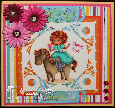 My card today features this wonderful digi image from SWEET PEA STAMPS Regan Kubecek's Sugar. I have colored her with Copics and chosen DP from my stash and CS from Bazzill and CTMH. Sentiment is from My Craft Spot and cut with Lifestyle Crafts die. Image is cut with Cheery Lynn Designs die and bling flourish is from Prima. Sure hope you like it and will come join the fun!!