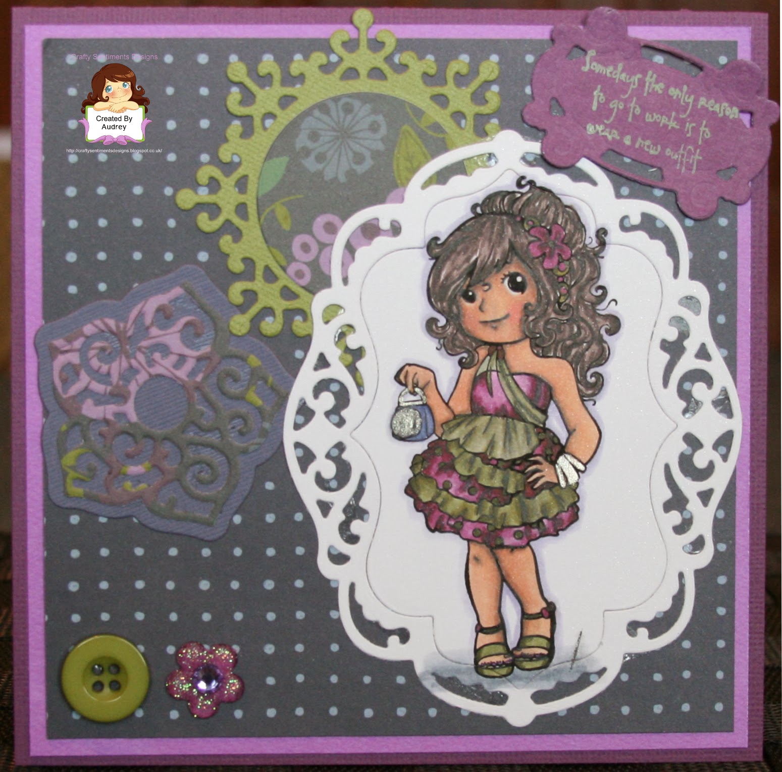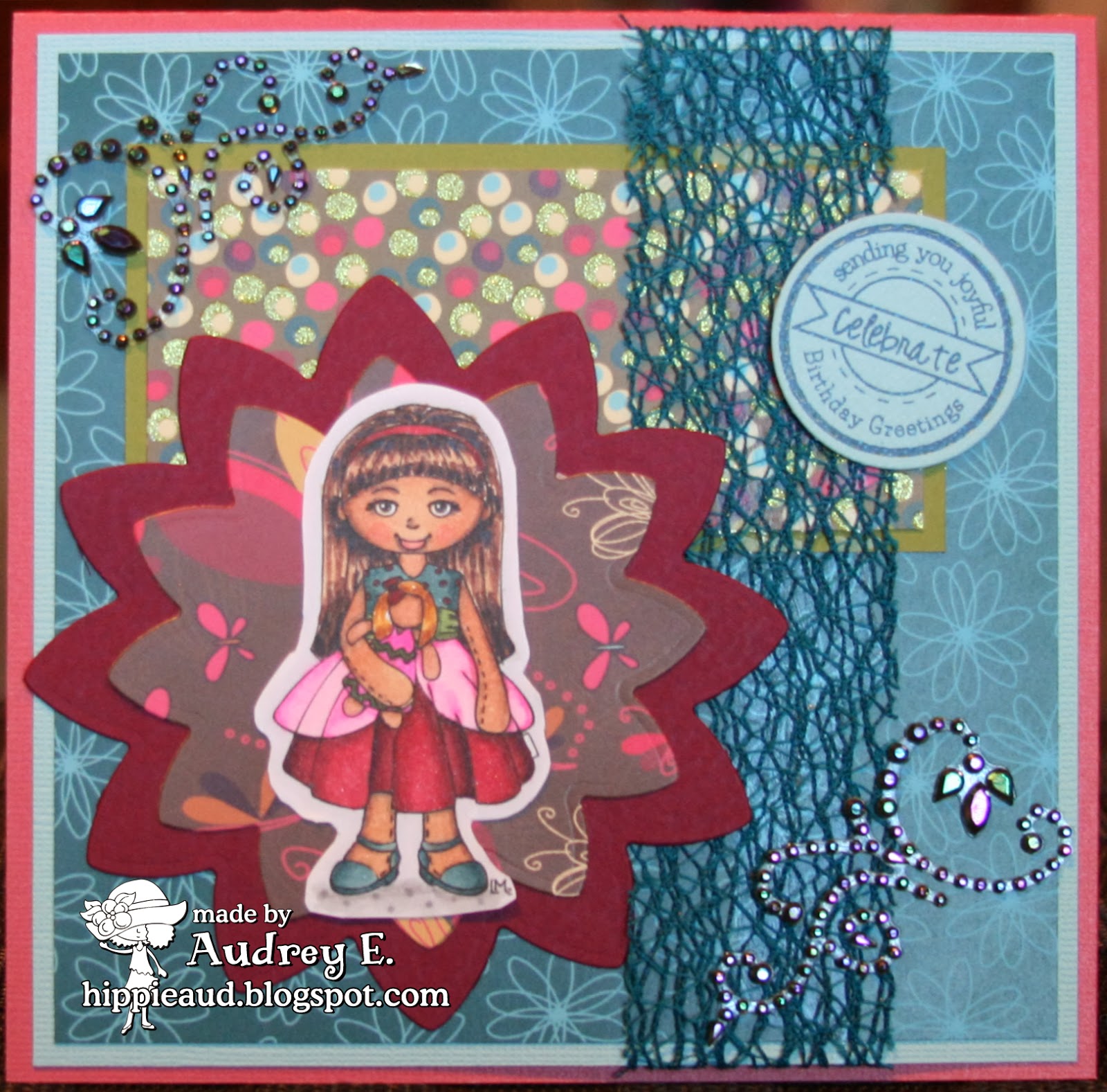 For my creation today, I have used CRAFTY SENTIMENTS DESIGNS rubber stamp Annabel Party Girl, which I have colored with Copics and Sakura pens. Image is cut with one of my new dies - from Hot Off the Press. Sentiment is from Rubbernecker Stamps and cut with a new die from Marianne Design. Buttons are from my stash. DP is also new from CTMH and CS is Bazzill and Bo Bunny. Sure hope you like it and will come play along:)