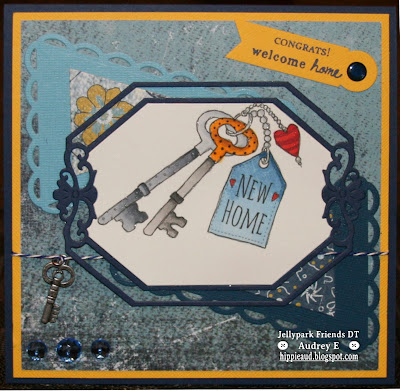 For my creation today, I have used JELLYPARK New Release image "New Home House Keys." I have colored this lovely image with Copics, Sakura and Copic Multiliner pens and cut out with Top Dog die. Banner dies are Nesties and tag die is from MFT. Sentiments are from Taylored Expressions and Gina K. Designs, Bo Bunny blue sticky dot used on sentiment tag, bling is from Doodlebug Design. Key charm is from Blue Moon Charms and twine if from Doodlebug as well. I sure hope you like it and will come play along!!