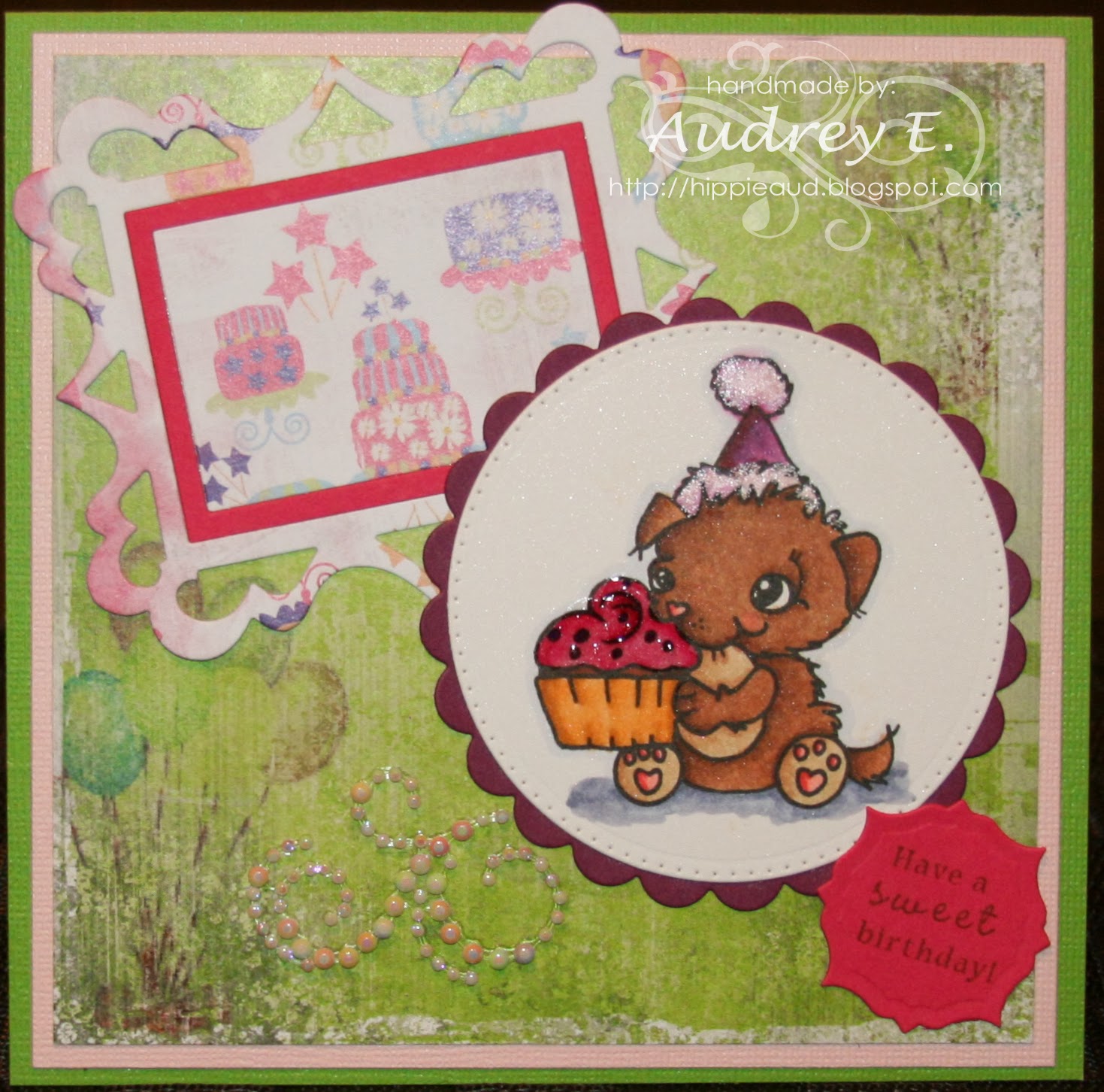 My creation uses the New Release Cupcake Pup by Miss Rach . I have also used Good Times 6x6 Designer Paper by Michele Roos, which is New to my ever growing collection of DP. Image is colored with Copics and I have added Stickles and JudiKins glaze. Image cut out with A. Jillian Vance Designs die and Lawn Fawn dies. Die in upper left is New, but I am not sure where it's from. Sentiment from Taylored Expressions is cut with Nestie and pearl flourish is from Prima. Sure hope you like it and that you will visit WHIMSY STAMPS and check out all the shop has to offer!!