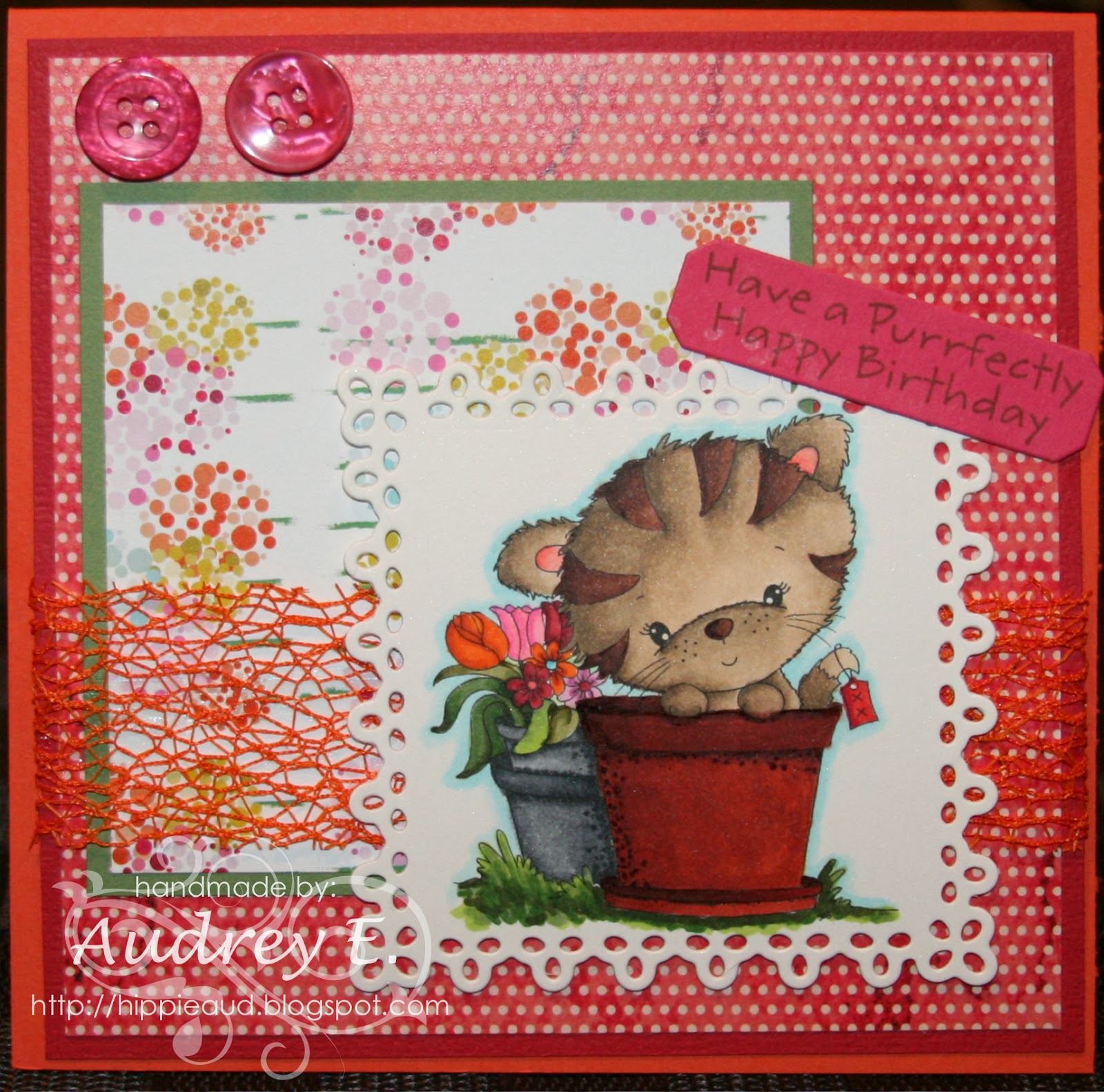 I have made a card using SAMI STAMPS SHOP image PRETTY KITTY HEART. Image is colored with Copics and cut out with Nellie's die. I used sentiments from My Craft Spot which is cut with Taylored Expressions die. Heart die cut border is from My Craft Spot. Die shapes in upper right are cut with Sizzix dies. DP is from K and Co. and CS is Bazzill and CTMH. Bling is from The Paper Studio. I sure hope you like it:)